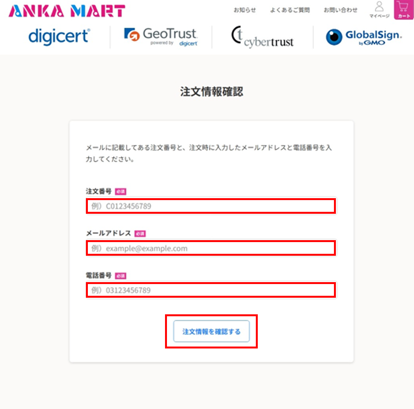 ご注文詳細ページへアクセスし、必要情報(注文番号、メールアドレス、電話番号)を入力のうえ、[注文情報を確認する]ボタンをクリックをしてください。