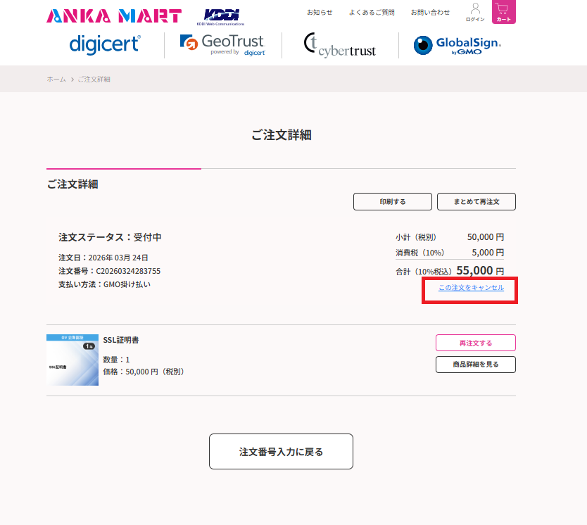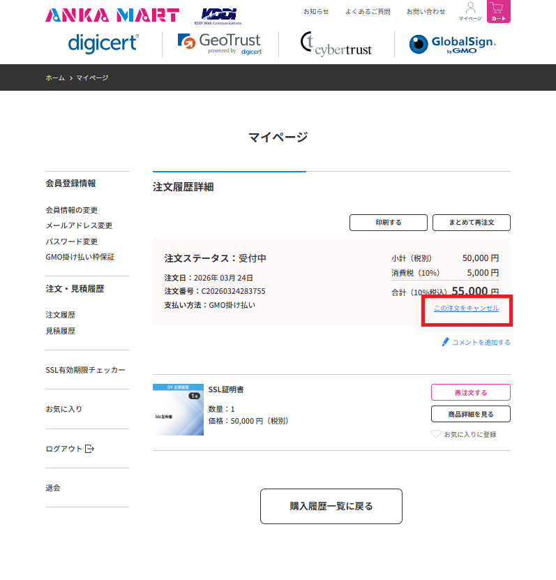 ご注文詳細ページからキャンセルする方法