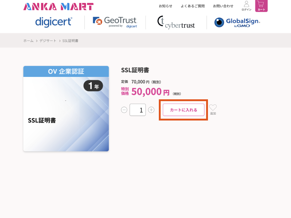 お見積もりしたい商品ページで、[カートに入れる]ボタンをクリックします。カート画面に移動します。