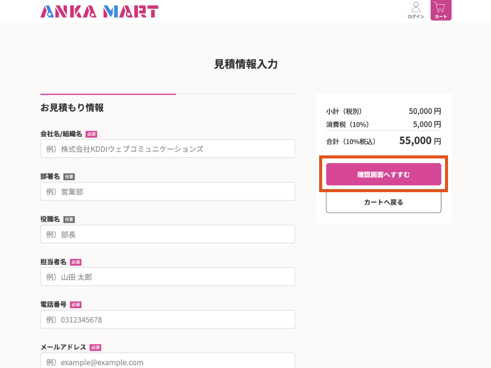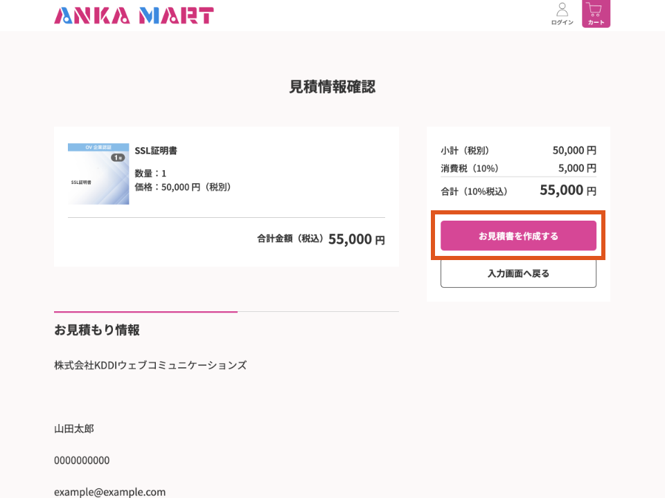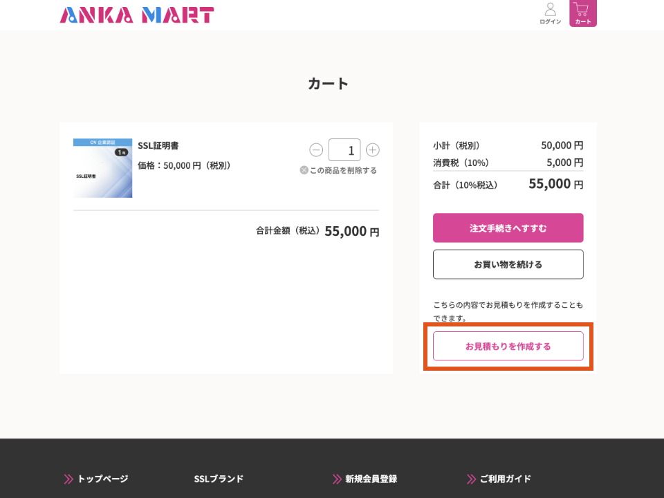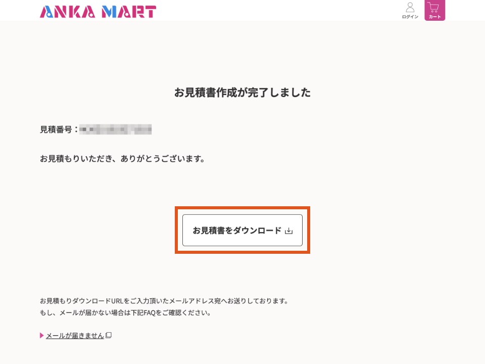 カート画面で[お見積もりを作成する]ボタンをクリックします。