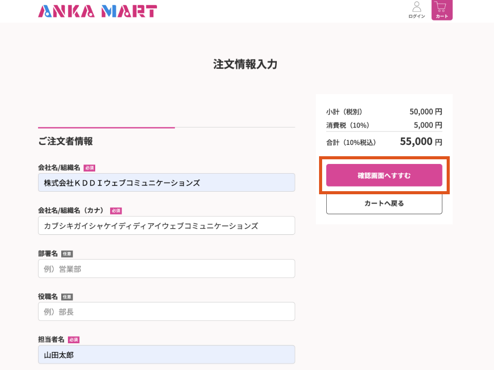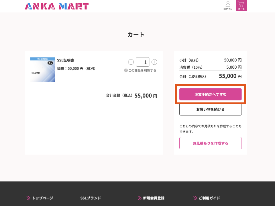 カート画面で[注文手続きへすすむ]ボタンをクリックします。