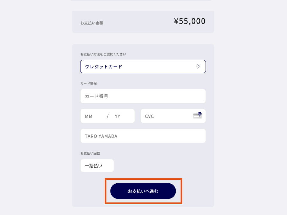 クレジットカード決済を選択された方は、カード情報入力画面に進みます。内容を入力し、[お支払いへ進む]ボタンをクリックし、決済を完了してください。