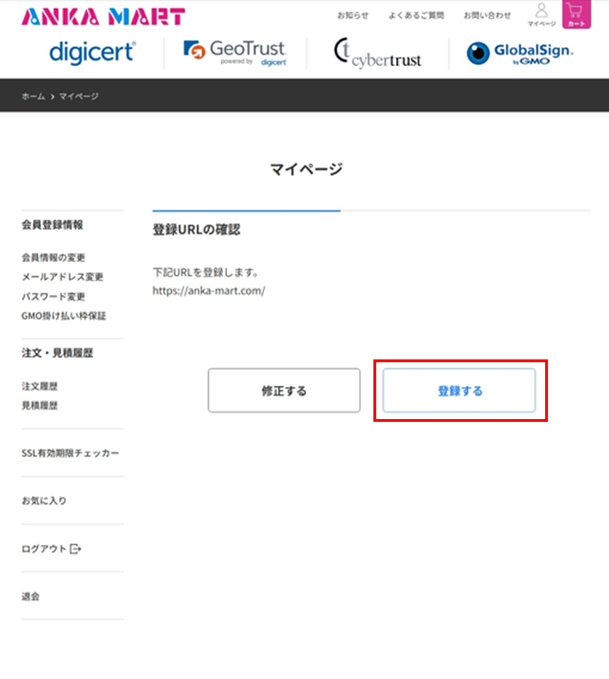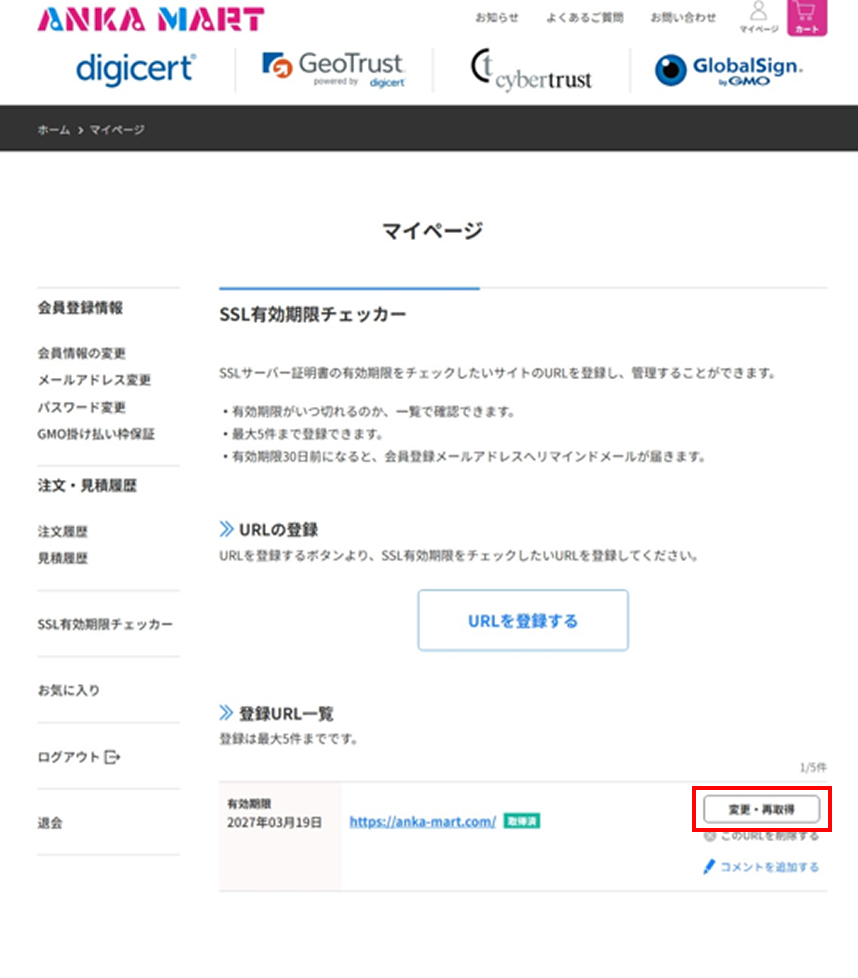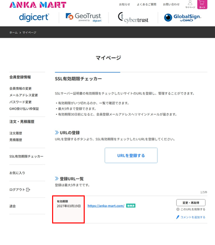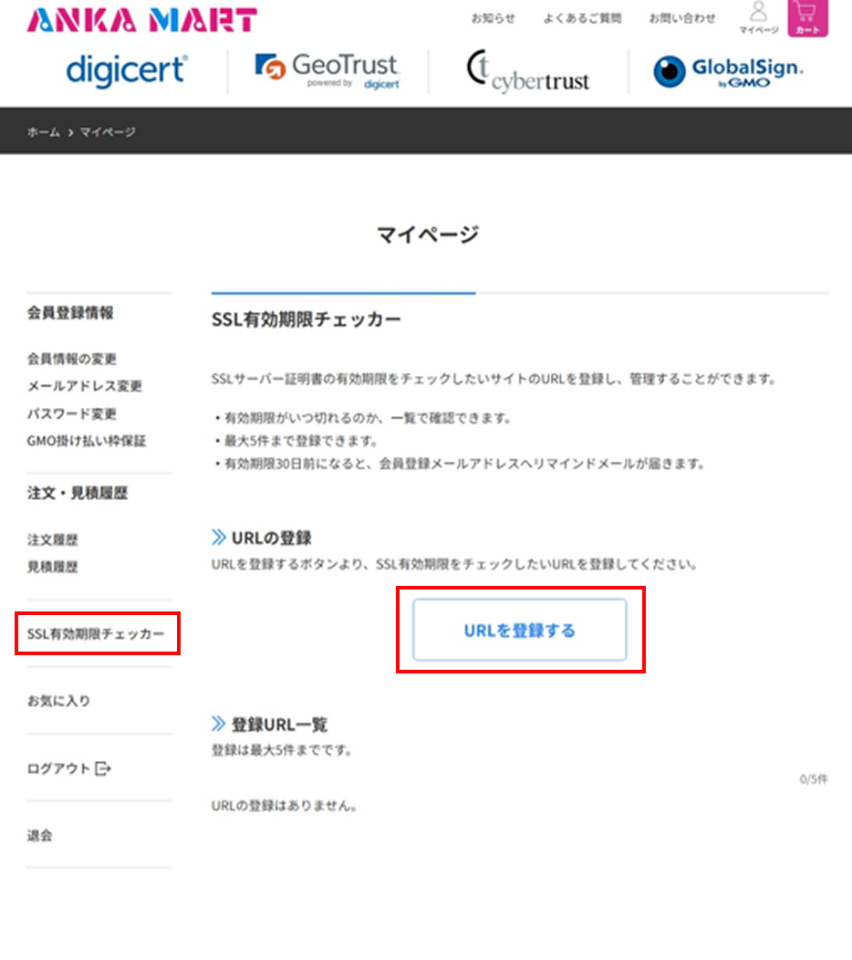 マイページへログイン後、左メニューの「SSL有効期限チェッカー」を選択し、[URLを登録する]ボタンをクリックしてください。