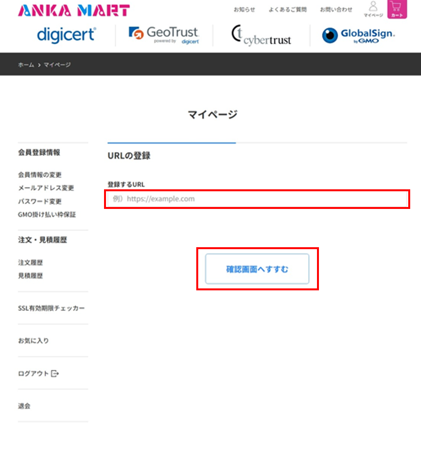 登録したいURLを入力し、[確認画面へすすむ]ボタンをクリックしてください。
