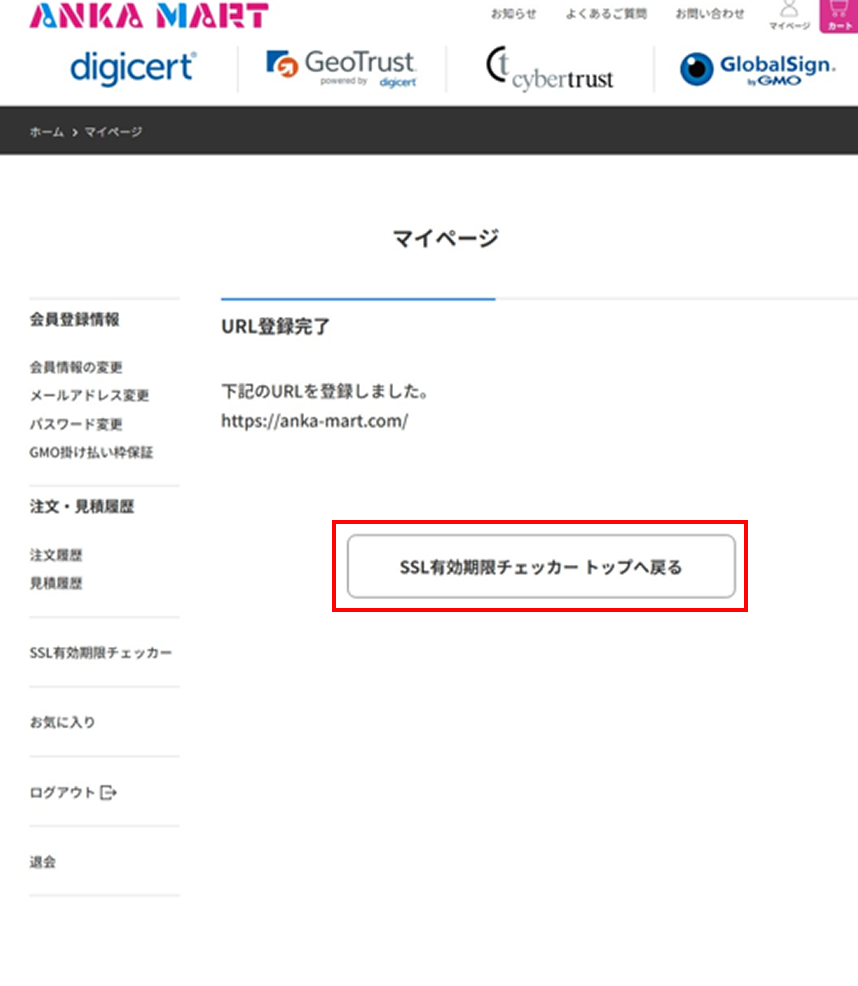 登録完了画面で、[SSL有効期限チェッカートップへ戻る]をクリックしてください。